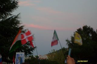 | «Giovani in festa a Medugorje cantano in coro, suplicano il Supremo per un mondo migliore.» |
